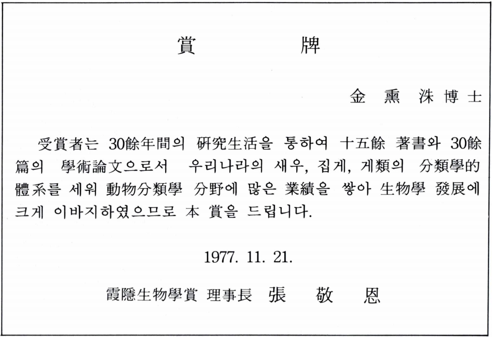 수상자는 30여 년간의 연구 생활을 통해 15권 이상의 저서와 30편이 넘는 학술 논문을 발표하며, 우리나라의 새우, 집게, 게류의 분류학적 체계를 정립하고 동물분류학 분야에 많은 업적을 쌓아 생물학 발전에 크게 이바지하였으므로 본 상을 드립니다.