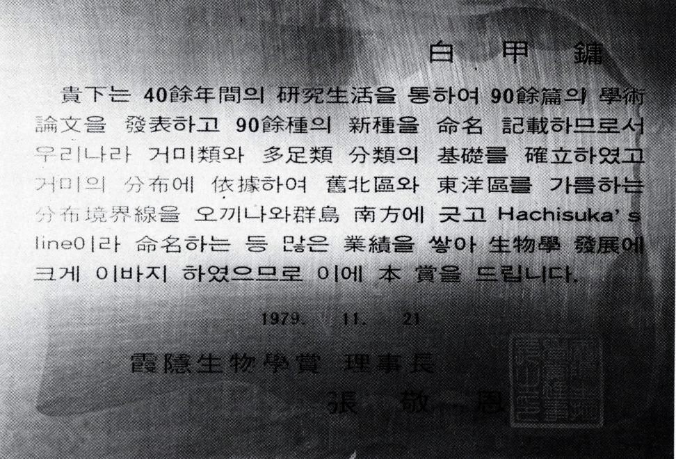 귀하는 40여 년간의 연구생활을 통해 90여 편의 학술논문을 발표하고, 90여 종의 신종을 명명·기재함으로써 우리나라 거미류와 다족류(多足類) 분류의 기초를 확립하였고, 거미의 분포에 의거하여 팔북(八北)지역과 동양구(東洋區)를 가름하는 분포 경계선을 오끼나와 군도 남쪽에 긋고 ‘Hachisuka’s line’이라 명명하는 등 많은 업적을 쌓아 생물학 발전에 크게 이바지하였으므로 이에 본 상을 드립니다.