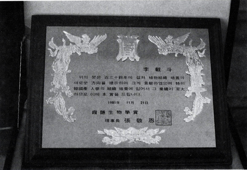 귀하는 30여 년간 식물 조직 배양 분야에서 새로운 방향을 제시하여 크게 공헌하였으며, 특히 한국산 인삼의 조직 배양에 있어 그 업적이 뛰어나므로 이에 본 상을 드립니다.
