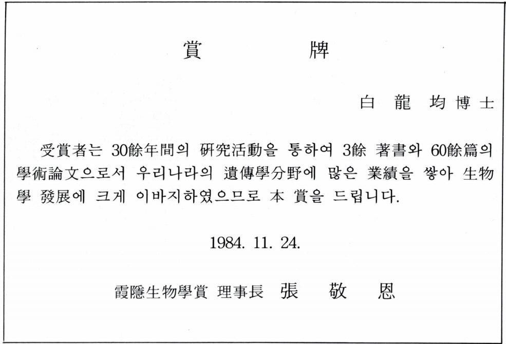 수상자는 30여 년간의 연구 활동을 통해 3권 이상의 저서와 60여 편의 학술 논문을 발표하여, 우리나라 유전학 분야에 많은 업적을 남기고 생물학 발전에 크게 이바지하였으므로 본 상을 드립니다.