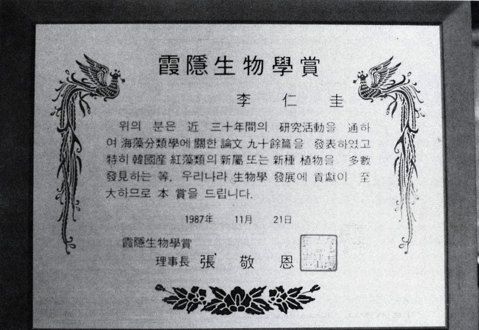 위 분은 근 30년간의 연구 활동을 통하여 해조류 분류학에 관한 논문 90여 편을 발표하셨고, 특히 한국산 홍조류의 신속 또는 신종 식물을 다수 발견하는 등, 우리나라 생물학 발전에 공헌이 지대하므로 본 상을 드립니다.