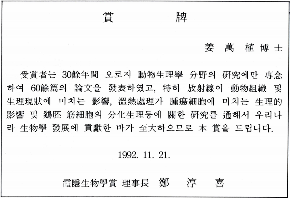 수상자는 삼십여년간 오로지 동물생리학 분야의 연구에만 전념하여 육십여 편의 논문을 발표하였고, 특히 방사선이 동물조직 및 생리현상에 미치는 영향, 온열처리가 종양세포에 미치는 생리적 영향 및 계배 근세포의 분화생리 등에 관한 연구를 통해서 우리나라 생물학 발전에 공헌한 바가 지대하므로 본 상을 드립니다.