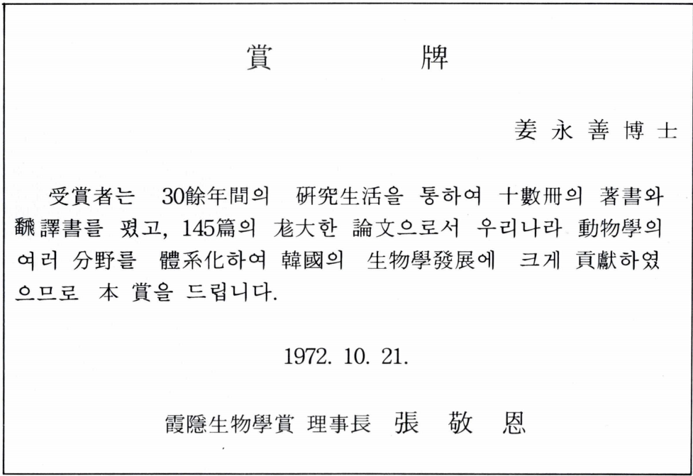 수상자는 30여 년간의 연구 생활을 통해 10여 권의 저서와 번역서를 집필하였으며, 총 145편에 달하는 방대한 논문으로 우리나라 동물학의 여러 분야를 체계화하여 한국 생물학 발전에 크게 공헌하였으므로 이 상을 드립니다.