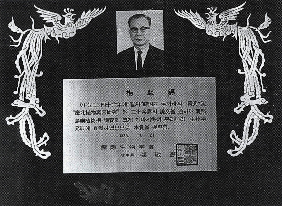 이 분은 40여년에 걸쳐 한국산 국화과의 연구 및 『경북식물조사연구』 외 30여 편의 논문을 통하여 남한 도서(島嶼) 식물상 조사에 크게 이바지하여 우리나라 생물학 발전에 공헌하였으므로 본 상을 수여함.